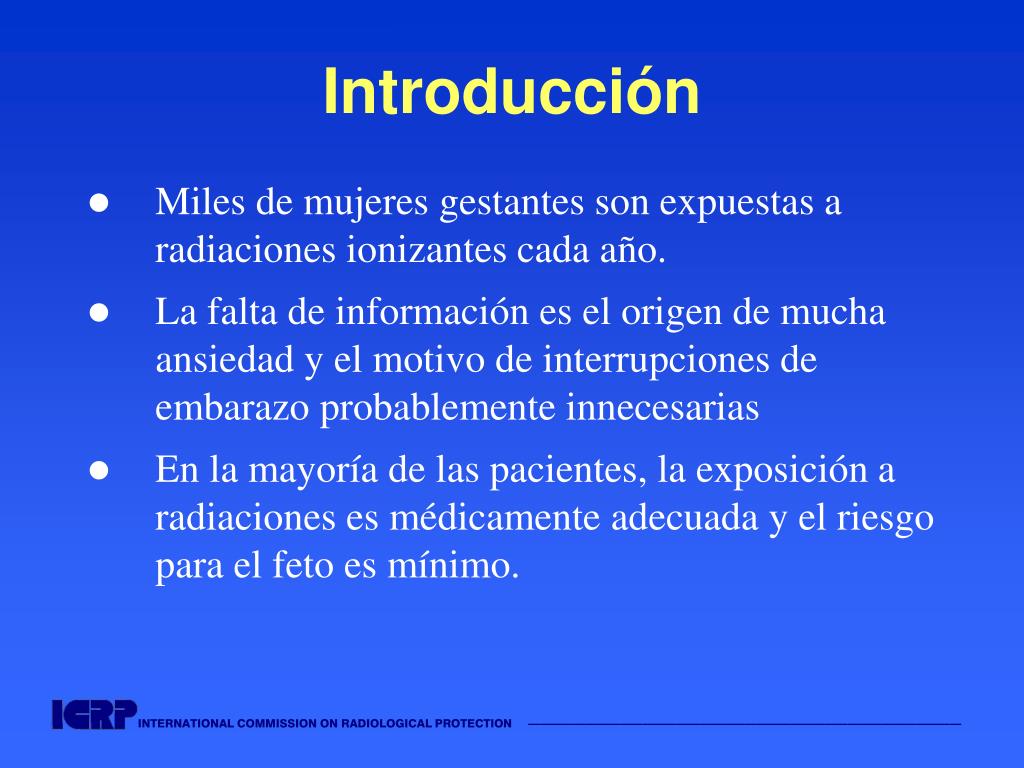 Introducción • Miles de mujeres gestantes son expuestas a radiaciones ionizantes cada año. • La falta de información es el origen de mucha ansiedad y el motivo de interrupciones de embarazo probablemente innecesarias • En la mayoría de las pacientes, la exposición a radiaciones es médicamente adecuada y el riesgo para el feto es mínimo. INTERNATIONAL COMMISSION ON RADIOLOGICAL PROTECTION ——————————————————————————————————————