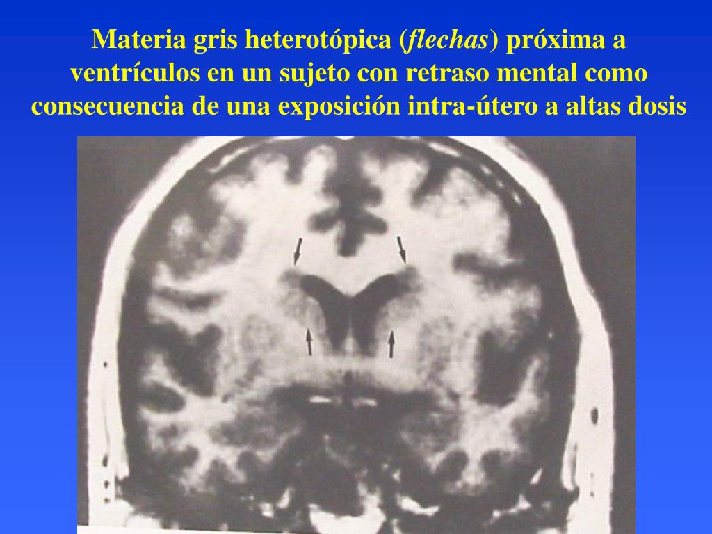 Materia gris heterotópica (flechas) próxima a ventrículos en un sujeto con retraso mental como consecuencia de una exposición intra-útero a altas dosis