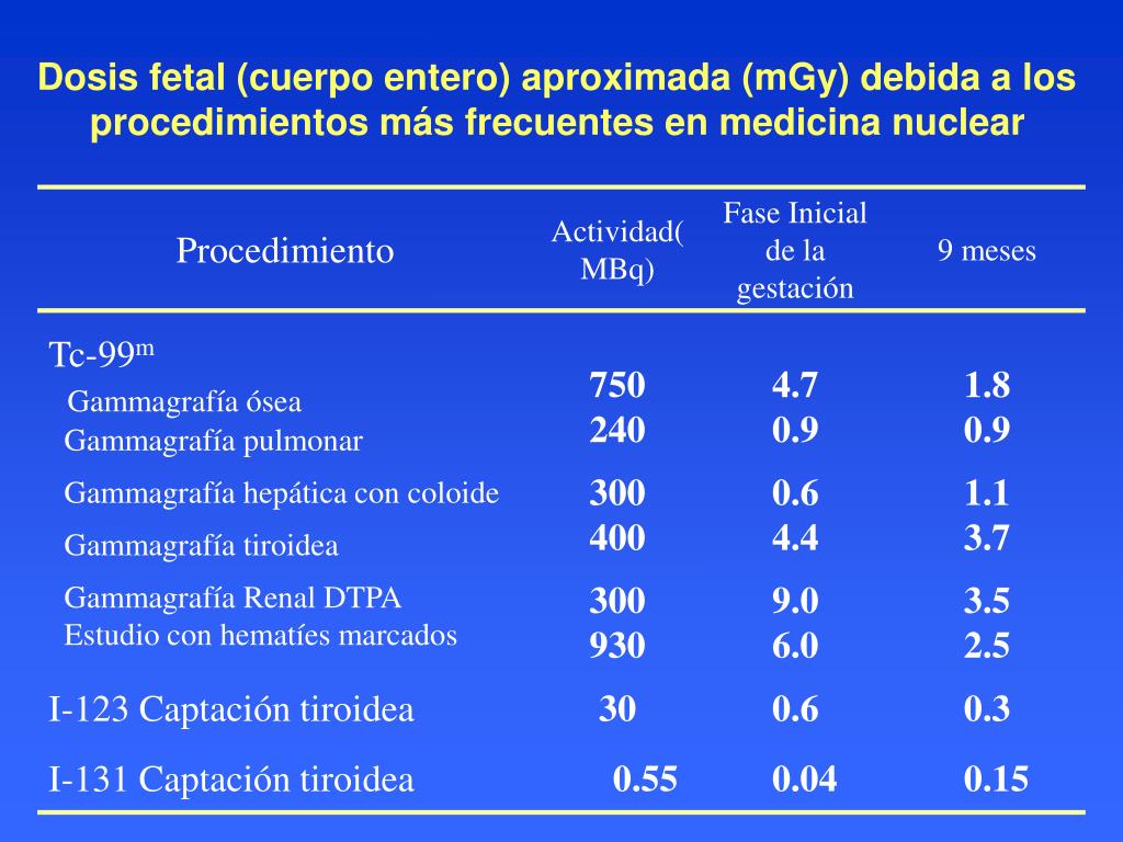 Dosis fetal (cuerpo entero) aproximada (mGy) debida a los procedimientos más frecuentes en medicina nuclear
