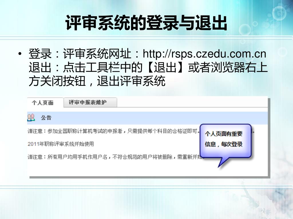 评审系统的登录与退出 • 登录:评审系统网址:http://rsps.czedu.com.cn退出:点击工具栏中的【退出】或者浏览器右上方关闭按钮,退出评审系统