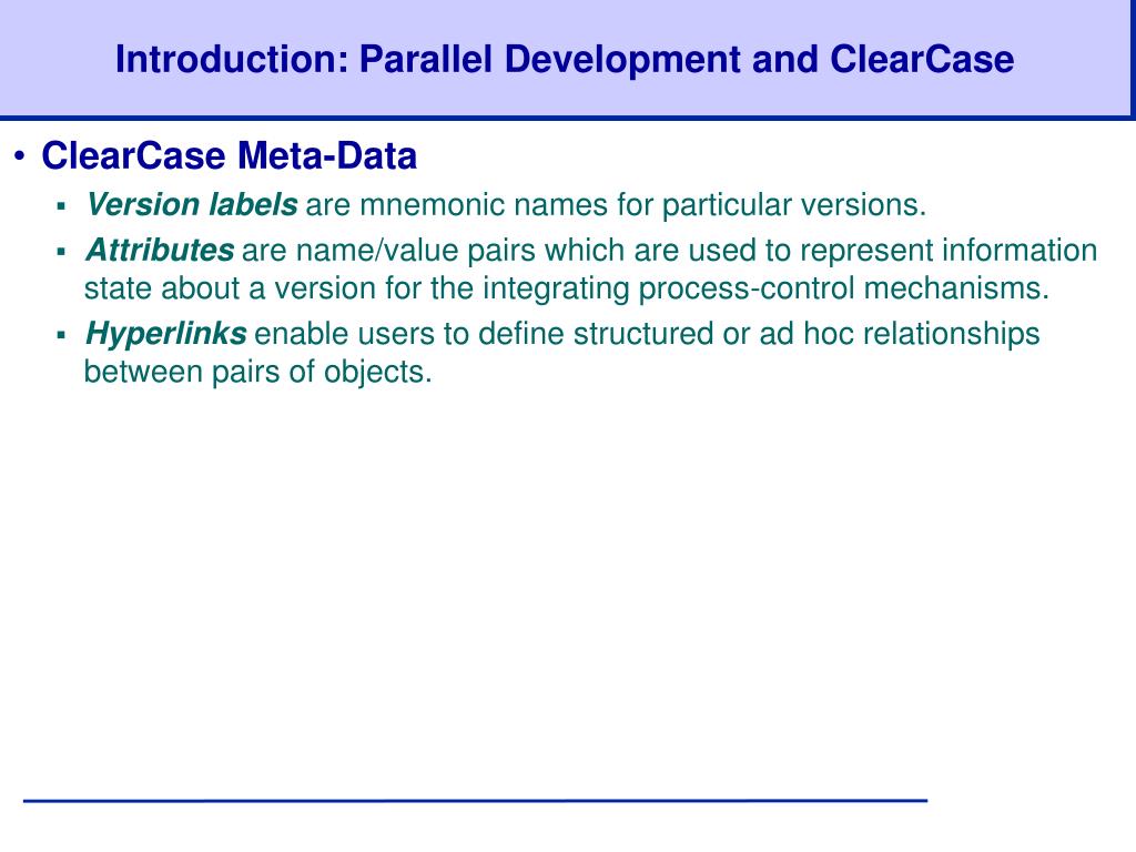 Introduction: Parallel Development and ClearCase • ClearCase Meta-Data • Versionlabels are mnemonic names for particular versions. • Attributes are name/value pairs which are used to represent information state about a version for the integrating process-control mechanisms. • Hyperlinksenable users to define structured or ad hoc relationships between pairs of objects.