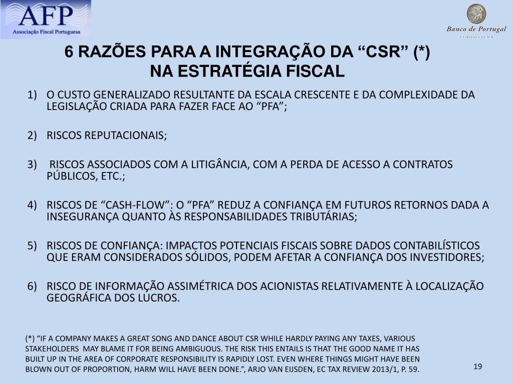 6 RAZÕES PARA A INTEGRAÇÃO DA “CSR” (*) NA ESTRATÉGIA FISCAL • O CUSTO GENERALIZADO RESULTANTE DA ESCALA CRESCENTE E DA COMPLEXIDADE DA LEGISLAÇÃO CRIADA PARA FAZER FACE AO “PFA”; • RISCOS REPUTACIONAIS; • RISCOS ASSOCIADOS COM A LITIGÂNCIA, COM A PERDA DE ACESSO A CONTRATOS PÚBLICOS, ETC.; • RISCOS DE “CASH-FLOW”: O “PFA” REDUZ A CONFIANÇA EM FUTUROS RETORNOS DADA A INSEGURANÇA QUANTO ÀS RESPONSABILIDADES TRIBUTÁRIAS; • RISCOS DE CONFIANÇA: IMPACTOS POTENCIAIS FISCAIS SOBRE DADOS CONTABILÍSTICOS QUE ERAM CONSIDERADOS SÓLIDOS, PODEM AFETAR A CONFIANÇA DOS INVESTIDORES; • RISCO DE INFORMAÇÃO ASSIMÉTRICA DOS ACIONISTAS RELATIVAMENTE À LOCALIZAÇÃO GEOGRÁFICA DOS LUCROS. (*) “IF A COMPANY MAKES A GREAT SONG AND DANCE ABOUT CSR WHILE HARDLY PAYING ANY TAXES, VARIOUS STAKEHOLDERS MAY BLAME IT FOR BEING AMBIGUOUS. THE RISK THIS ENTAILS IS THAT THE GOOD NAME IT HAS BUILT UP IN THE AREA OF CORPORATE RESPONSIBILITY IS RAPIDLY LOST. EVEN WHERE THINGS MIGHT HAVE BEEN BLOWN OUT OF PROPORTION, HARM WILL HAVE BEEN DONE.”, ARJO VAN EIJSDEN, EC TAX REVIEW 2013/1, P. 59.