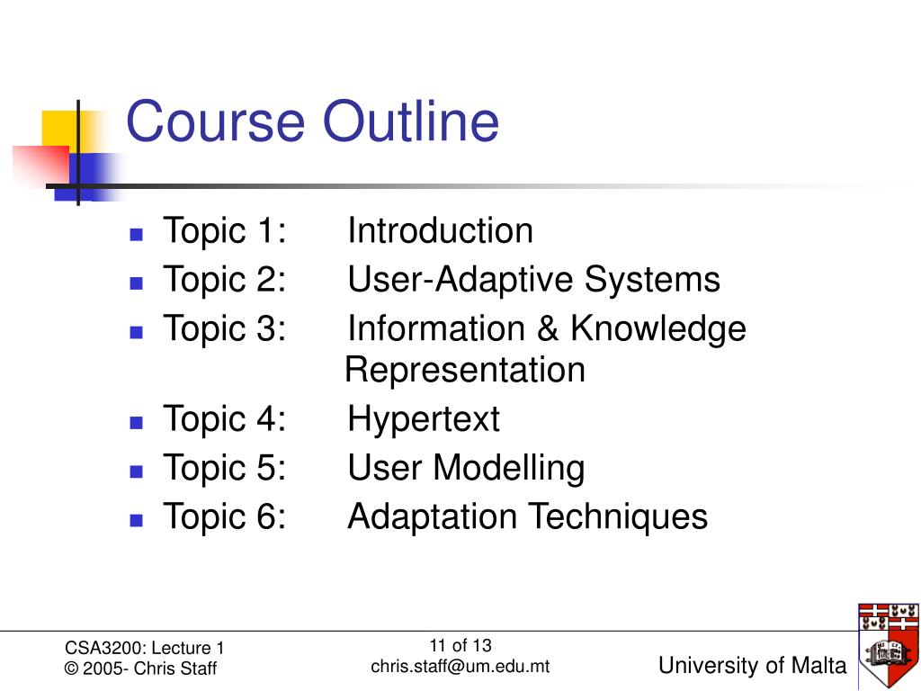 Course Outline • Topic 1: Introduction • Topic 2: User-Adaptive Systems • Topic 3: Information & Knowledge Representation • Topic 4: Hypertext • Topic 5: User Modelling • Topic 6: Adaptation Techniques