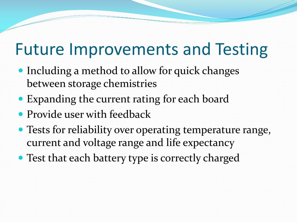 Future Improvements and Testing • Including a method to allow for quick changes between storage chemistries • Expanding the current rating for each board • Provide user with feedback • Tests for reliability over operating temperature range, current and voltage range and life expectancy • Test that each battery type is correctly charged