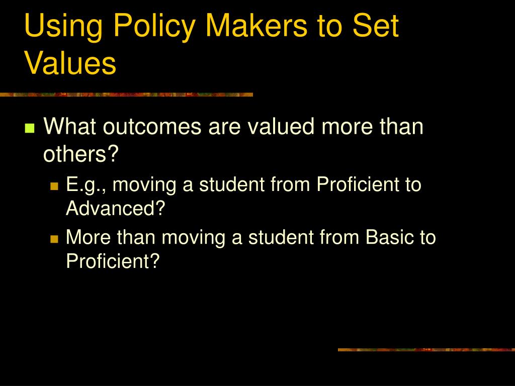 Using Policy Makers to Set Values • What outcomes are valued more than others? • E.g., moving a student from Proficient to Advanced? • More than moving a student from Basic to Proficient?