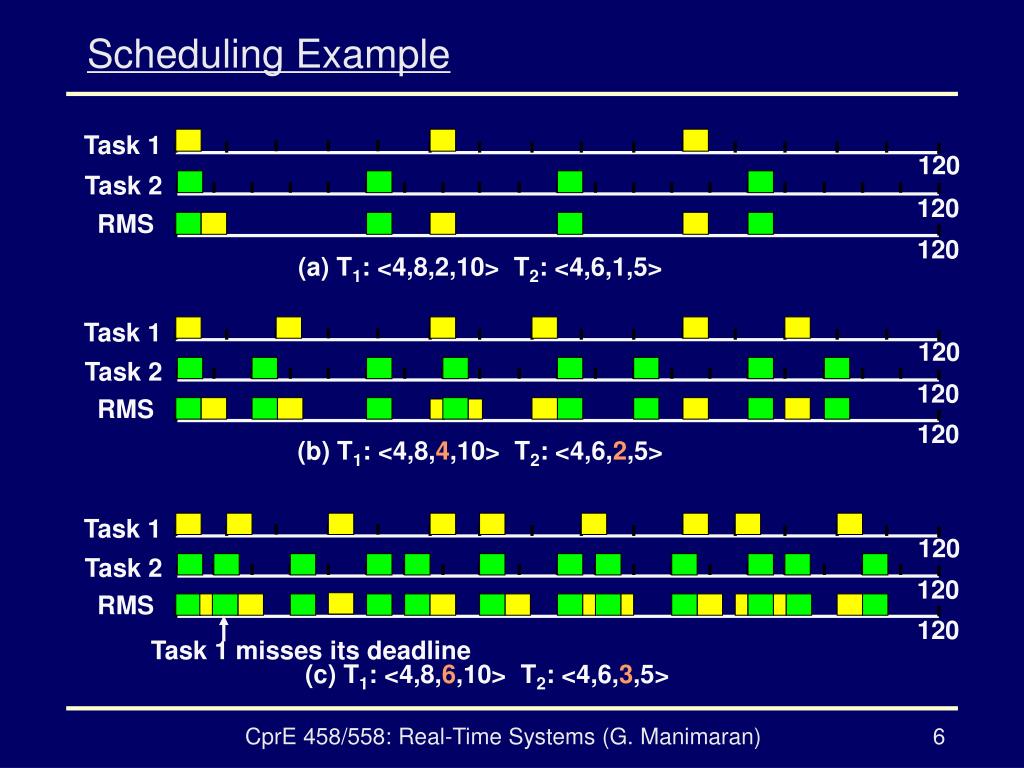 Task 1 120 Task 2 120 RMS 120 (a) T1: <4,8,2,10> T2: <4,6,1,5> Task 1 120 Task 2 120 RMS 120 (b) T1: <4,8,4,10> T2: <4,6,2,5> Task 1 120 Task 2 120 RMS 120 Task 1 misses its deadline (c) T1: <4,8,6,10> T2: <4,6,3,5> Scheduling Example CprE 458/558: Real-Time Systems (G. Manimaran)