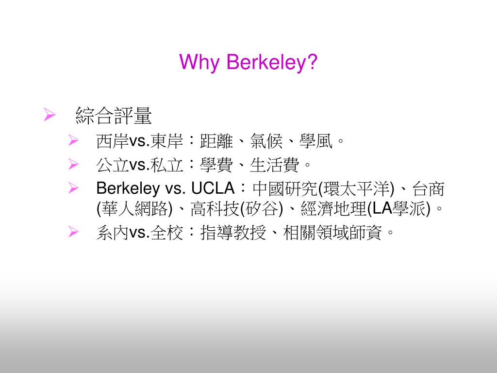 Why Berkeley? • 綜合評量 • 西岸vs.東岸:距離、氣候、學風。 • 公立vs.私立:學費、生活費。 • Berkeley vs. UCLA:中國研究(環太平洋)、台商(華人網路)、高科技(矽谷)、經濟地理(LA學派)。 • 系內vs.全校:指導教授、相關領域師資。