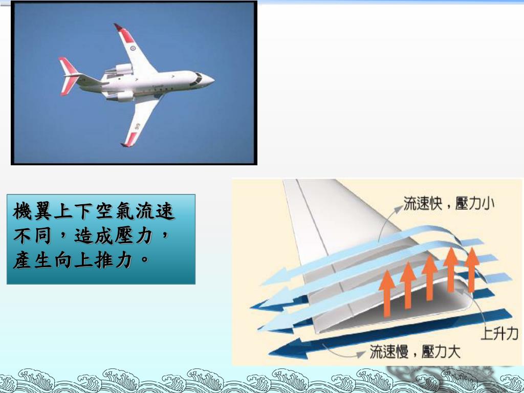機翼上下空氣流速不同,造成壓力,產生向上推力。機翼上下空氣流速不同,造成壓力,產生向上推力。 2