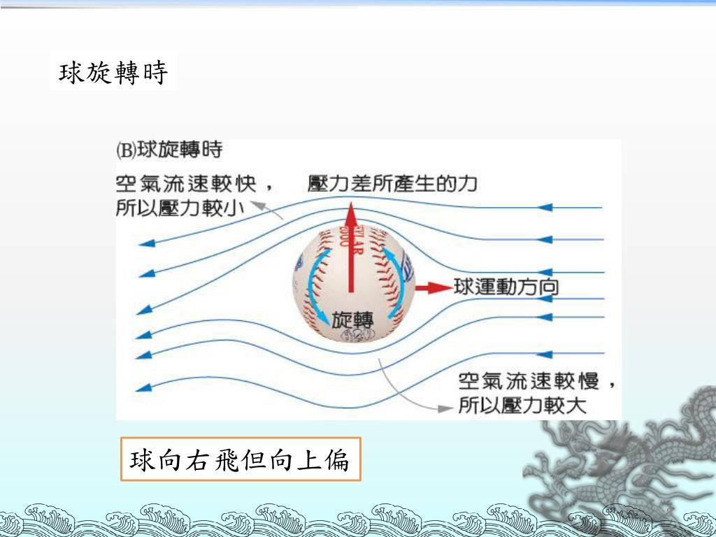 當高度變化可忽略時,或維持為水平流動,則白努利方程式可簡化為:當高度變化可忽略時,或維持為水平流動,則白努利方程式可簡化為: 流速快的地方壓力小,流速慢的地方壓力大。 有速度差時,會造成壓力差。