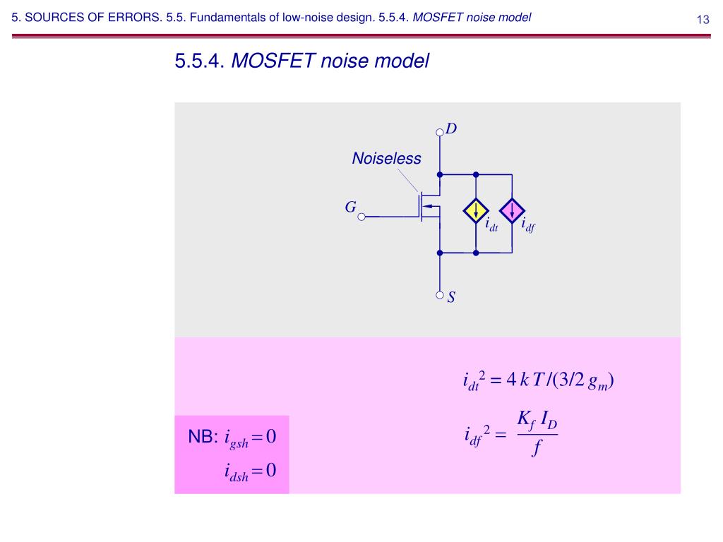 idt2= 4kT/(3/2gm) Kf ID f idf 2= 5. SOURCES OF ERRORS. 5.5. Fundamentals of low-noise design. 5.5.4. MOSFET noise model 5.5.4. MOSFET noise model D Noiseless G idt idf S NB: igsh =0 idsh =0