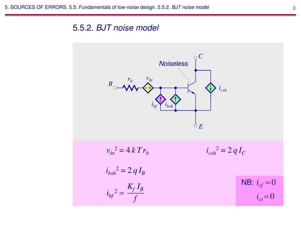 vbt2= 4kTrb icsh2= 2qIC ibsh2= 2qIB Kf IB f ibf 2= 5. SOURCES OF ERRORS. 5.5. Fundamentals of low-noise design. 5.5.2. BJT noise model 5.5.2. BJT noise model C Noiseless vbt rb B icsh ibf ibsh E NB: icf =0 ict =0