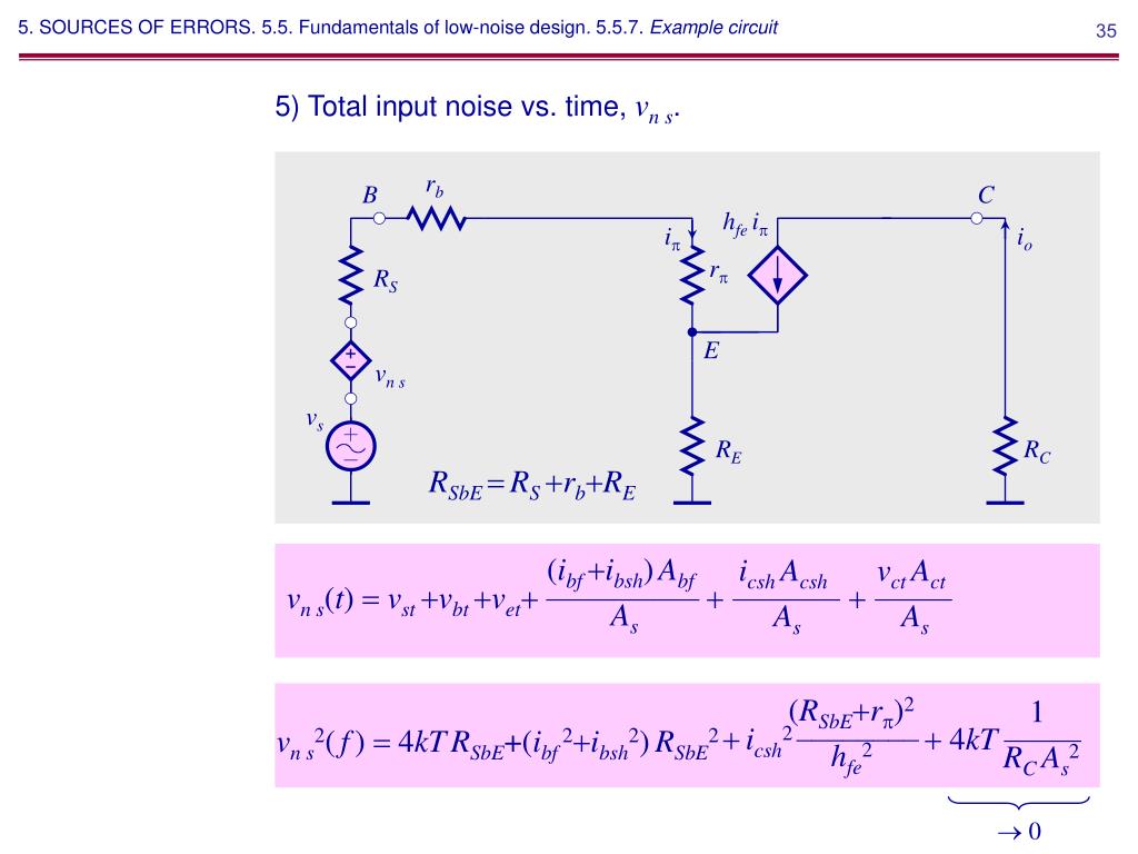 vn s (ibf +ibsh)Abf As icsh Acsh As vct Act As vn s(t) = vst +vbt +vet + + + __________ _______ _____ (RSbE+rp)2 hfe2 1 RC As2 +icsh2 + 4kT ________ _____ vn s2(f) = 4kTRSbE+(ibf 2+ibsh2)RSbE2 0 5. SOURCES OF ERRORS. 5.5. Fundamentals of low-noise design. 5.5.7. Example circuit • 5) Total input noise vs. time, vn s. rb B C hfe ip ip io rp RS E vs RE RC RSbE =RS +rb+RE