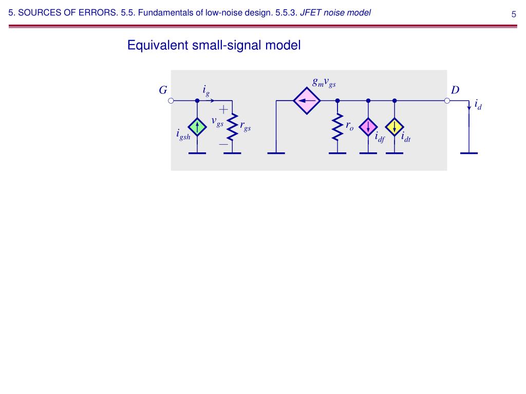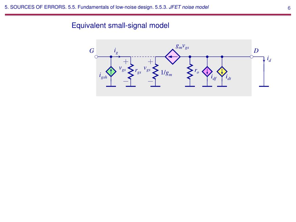 5. SOURCES OF ERRORS. 5.5. Fundamentals of low-noise design. 5.5.3. JFET noise model 5.4.3. JFET noise model D Noiseless G idf idt igsh S igsh2= 2qIG idt2= 4kT/(3/2gm) Kf ID f idf 2= NB: idsh =0