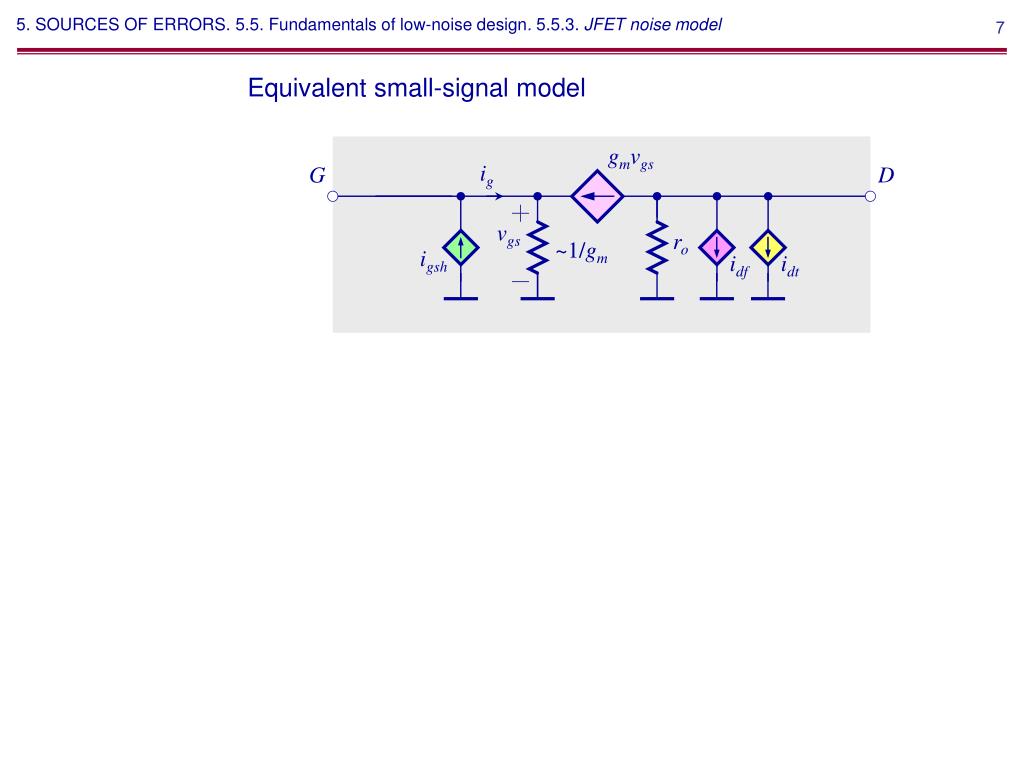 vgs 5. SOURCES OF ERRORS. 5.5. Fundamentals of low-noise design. 5.5.3. JFET noise model Equivalent small-signal model gmvgs ig G D ro ~1/gm igsh idf idt