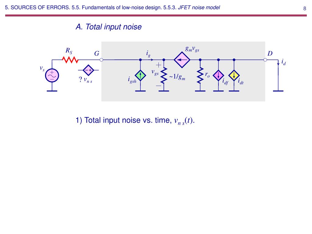 RS id vs vgs ? vn s 5. SOURCES OF ERRORS. 5.5. Fundamentals of low-noise design. 5.5.3. JFET noise model A. Total input noise gmvgs ig G D ro ~1/gm igsh idf idt 1) Total input noise vs. time, vn s(t).