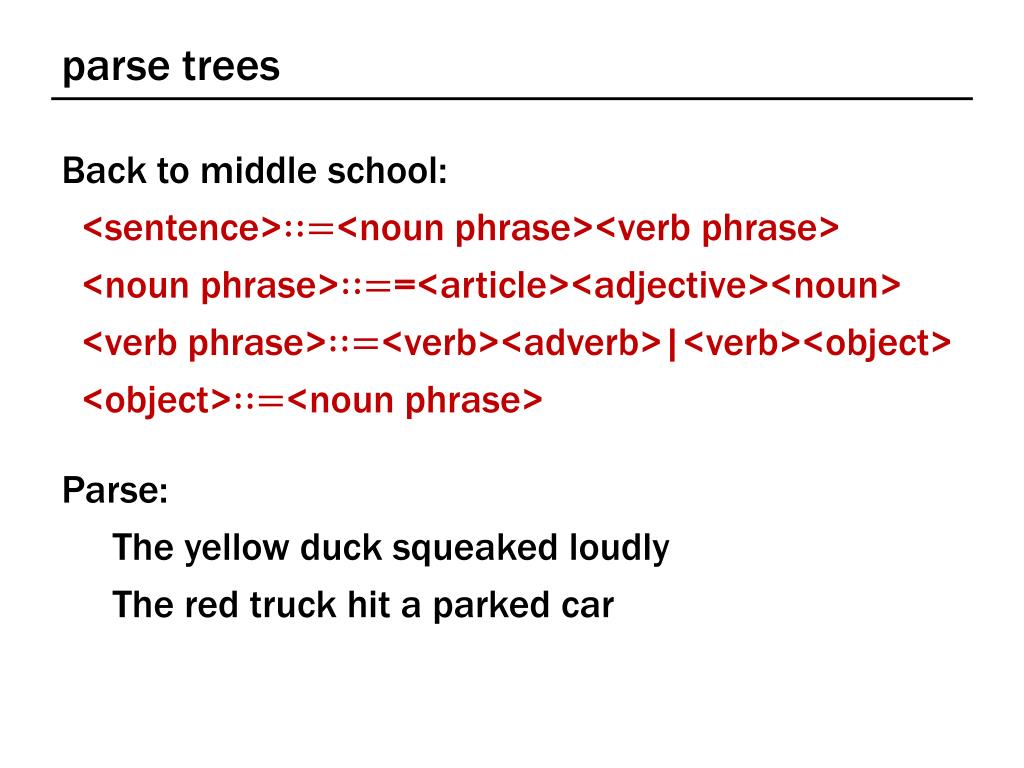parse trees Back to middle school: <sentence><noun phrase><verb phrase> <noun phrase>=<article><adjective><noun> <verb phrase><verb><adverb>|<verb><object> <object><noun phrase> Parse: The yellow duck squeaked loudly The red truck hit a parked car