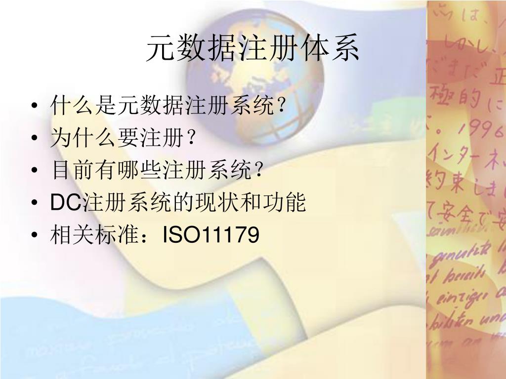 元数据注册体系 • 什么是元数据注册系统? • 为什么要注册? • 目前有哪些注册系统? • DC注册系统的现状和功能 • 相关标准:ISO11179