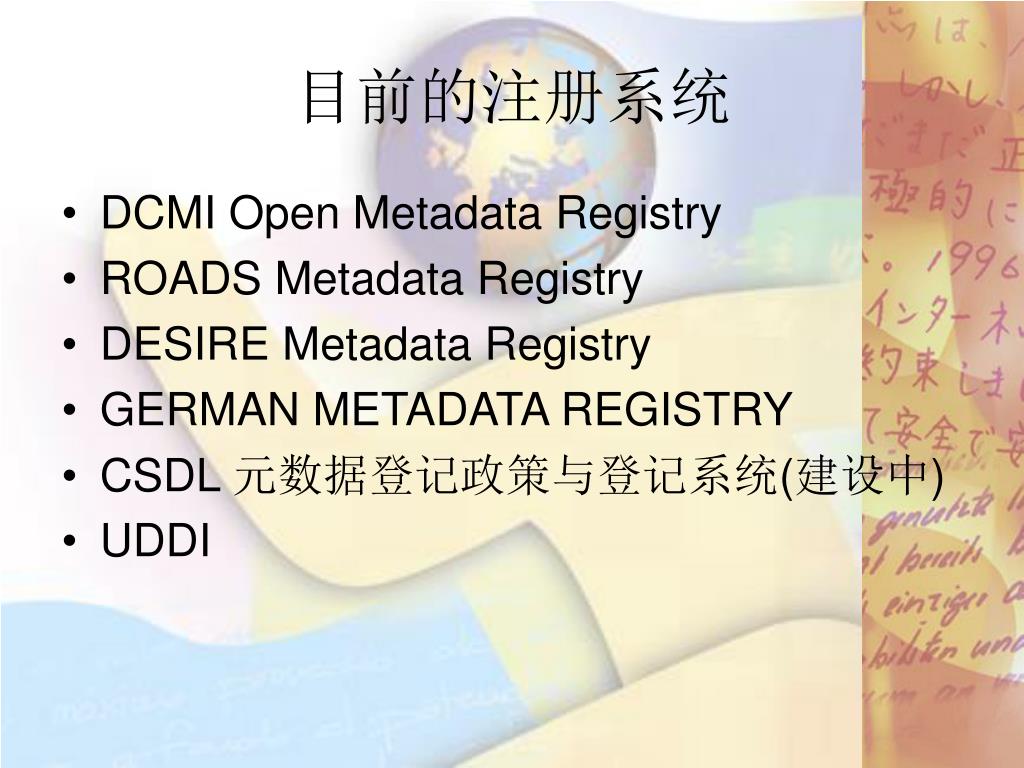 目前的注册系统 • DCMI Open Metadata Registry • ROADS Metadata Registry • DESIRE Metadata Registry • GERMAN METADATA REGISTRY • CSDL 元数据登记政策与登记系统(建设中) • UDDI