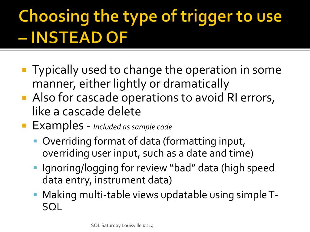 Choosing the type of trigger to use – INSTEAD OF SQL Saturday Louisville #214 • Typically used to change the operation in some manner, either lightly or dramatically • Also for cascade operations to avoid RI errors, like a cascade delete • Examples -Included as sample code • Overriding format of data (formatting input, overriding user input, such as a date and time) • Ignoring/logging for review “bad” data (high speed data entry, instrument data) • Making multi-table views updatable using simple T-SQL