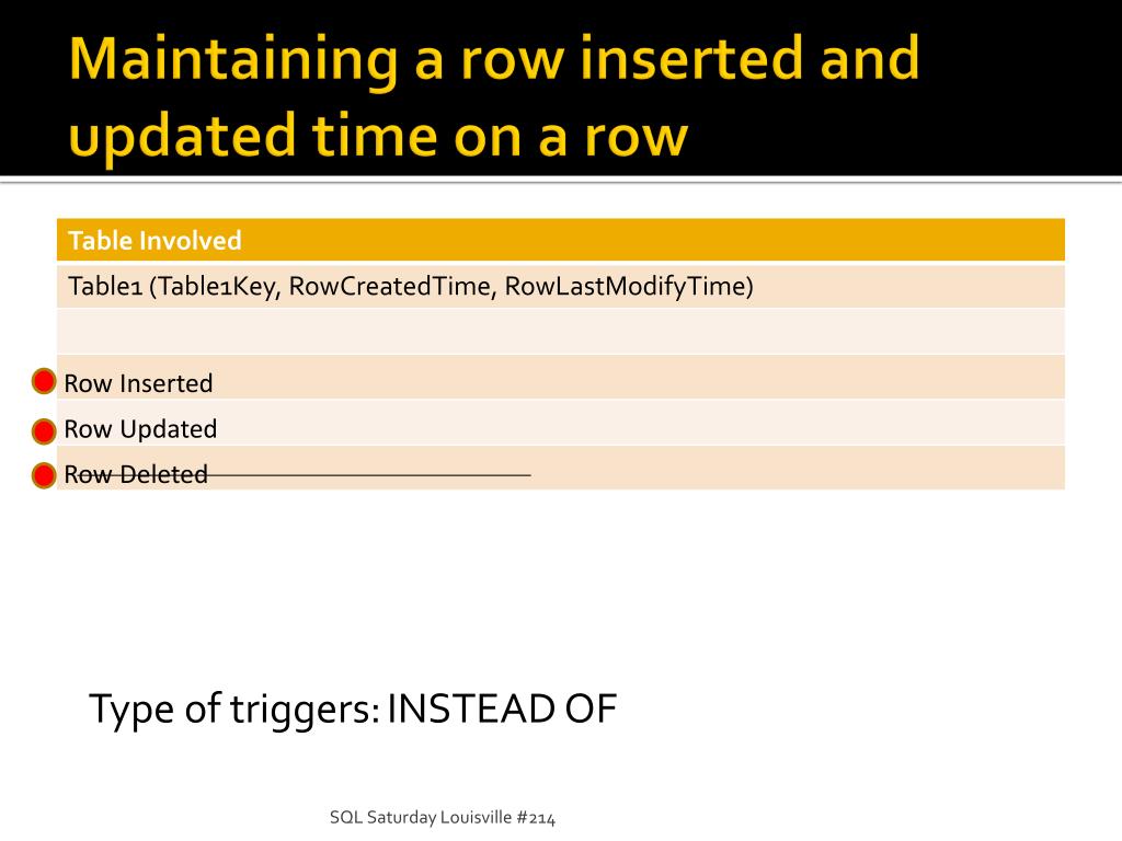 Maintaining a row inserted and updated time on a row Type of triggers: INSTEAD OF SQL Saturday Louisville #214