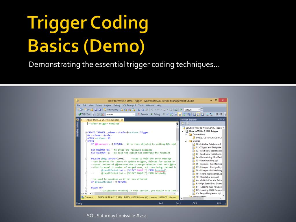 Trigger Coding Basics (Demo) Demonstrating the essential trigger coding techniques… SQL Saturday Louisville #214