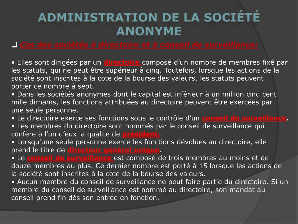 Administration de La Société anonyme • Cas des sociétés à directoire et à conseil de surveillance: • • Elles sont dirigées par un directoire composé d’un nombre de membres fixé par • les statuts, qui ne peut être supérieur à cinq. Toutefois, lorsque les actions de la • société sont inscrites à la cote de la bourse des valeurs, les statuts peuvent • porter ce nombre à sept. • • Dans les sociétés anonymes dont le capital est inférieur à un million cinq cent • mille dirhams, les fonctions attribuées au directoire peuvent être exercées par • une seule personne. • • Le directoire exerce ses fonctions sous le contrôle d’un conseil de surveillance. • • Les membres du directoire sont nommés par le conseil de surveillance qui confère à l’un d’eux la qualité de président. • • Lorsqu'une seule personne exerce les fonctions dévolues au directoire, elle • prend le titre de directeur général unique. • • Le conseil de surveillance est composé de trois membres au moins et de • douze membres au plus. Ce dernier nombre est porté à 15 lorsque les actions de • la société sont inscrites à la cote de la bourse des valeurs. • • Aucun membre du conseil de surveillance ne peut faire partie du directoire. Si un • membre du conseil de surveillance est nommé au directoire, son mandat au • conseil prend fin dès son entrée en fonction.