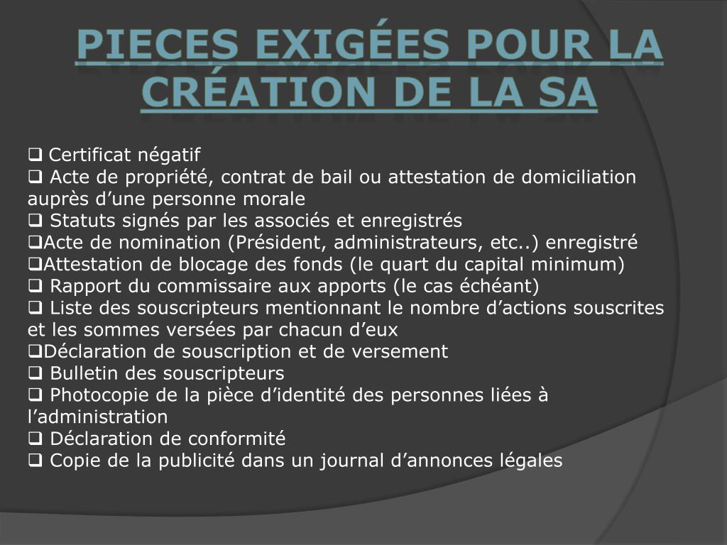 PIECES exigées pour la création de la sa • Certificat négatif • Acte de propriété, contrat de bail ou attestation de domiciliation auprès d’une personne morale • Statuts signés par les associés et enregistrés • Acte de nomination (Président, administrateurs, etc..) enregistré • Attestation de blocage des fonds (le quart du capital minimum) • Rapport du commissaire aux apports (le cas échéant) • Liste des souscripteurs mentionnant le nombre d’actions souscrites et les sommes versées par chacun d’eux • Déclaration de souscription et de versement • Bulletin des souscripteurs • Photocopie de la pièce d’identité des personnes liées à l’administration • Déclaration de conformité • Copie de la publicité dans un journal d’annonces légales