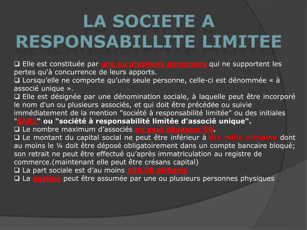 LA SOCIETE A RESPONSABILLITE LIMITEE • Elle est constituée par une ou plusieurs personnes qui ne supportent les • pertes qu'à concurrence de leurs apports. • Lorsqu’elle ne comporte qu'une seule personne, celle-ci est dénommée « à • associé unique ». • Elle est désignée par une dénomination sociale, à laquelle peut être incorporé le nom d'un ou plusieurs associés, et qui doit être précédée ou suivie • immédiatement de la mention "société à responsabilité limitée" ou des initiales • "SARL" ou "société à responsabilité limitée d'associé unique". • Le nombre maximum d’associés ne peut dépasser 50. • Le montant du capital social ne peut être inférieur à dix mille dirhams dont au moins le ¼ doit être déposé obligatoirement dans un compte bancaire bloqué; son retrait ne peut être effectué qu’après immatriculation au registre de • commerce.(maintenant elle peut être crésans capital) • La part sociale est d’au moins 100,00 dirhams • La gestionpeut être assumée par une ou plusieurs personnes physiques