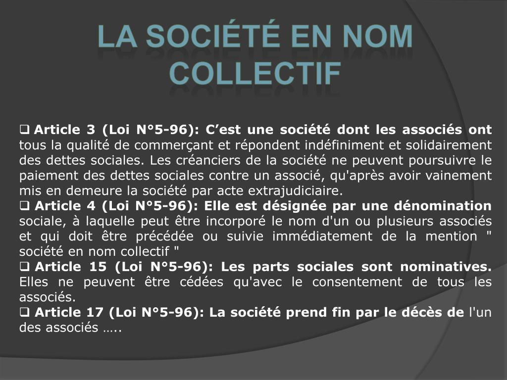 La Société en nom collectif • Article 3 (Loi N°5-96): C’est une société dont les associés ont tous la qualité de commerçant et répondent indéfiniment et solidairement des dettes sociales. Les créanciers de la société ne peuvent poursuivre le paiement des dettes sociales contre un associé, qu'après avoir vainement mis en demeure la société par acte extrajudiciaire. • Article 4 (Loi N°5-96): Elle est désignée par une dénomination sociale, à laquelle peut être incorporé le nom d'un ou plusieurs associés et qui doit être précédée ou suivie immédiatement de la mention " société en nom collectif " • Article 15 (Loi N°5-96): Les parts sociales sont nominatives. Elles ne peuvent être cédées qu'avec le consentement de tous les associés. • Article 17 (Loi N°5-96): La société prend fin par le décès de l'un des associés …..