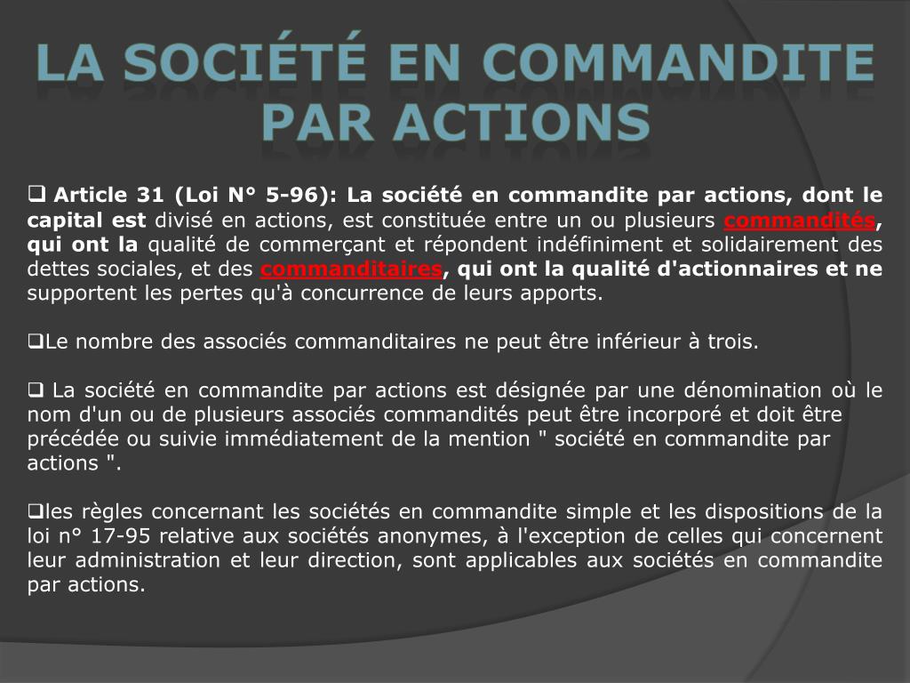 La Société en commandite par actions • Article 31 (Loi N° 5-96): La société en commandite par actions, dont le capital est divisé en actions, est constituée entre un ou plusieurs commandités, qui ont la qualité de commerçant et répondent indéfiniment et solidairement des dettes sociales, et des commanditaires, qui ont la qualité d'actionnaires et ne supportent les pertes qu'à concurrence de leurs apports. • Le nombre des associés commanditaires ne peut être inférieur à trois. • La société en commandite par actions est désignée par une dénomination où le nom d'un ou de plusieurs associés commandités peut être incorporé et doit être • précédée ou suivie immédiatement de la mention " société en commandite par • actions ". • les règles concernant les sociétés en commandite simple et les dispositions de la loi n° 17-95 relative aux sociétés anonymes, à l'exception de celles qui concernent leur administration et leur direction, sont applicables aux sociétés en commandite par actions.