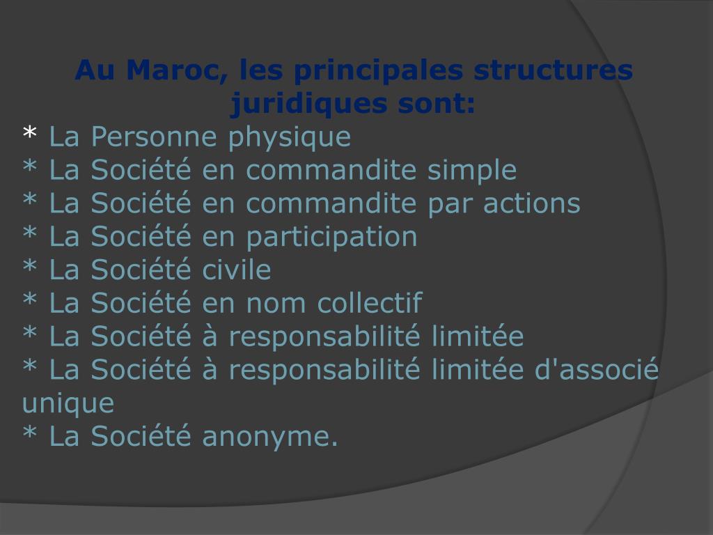 Au Maroc, les principales structures juridiques sont: * La Personne physique * La Société en commandite simple * La Société en commandite par actions * La Société en participation * La Société civile * La Société en nom collectif * La Société à responsabilité limitée * La Société à responsabilité limitée d'associé unique * La Société anonyme.