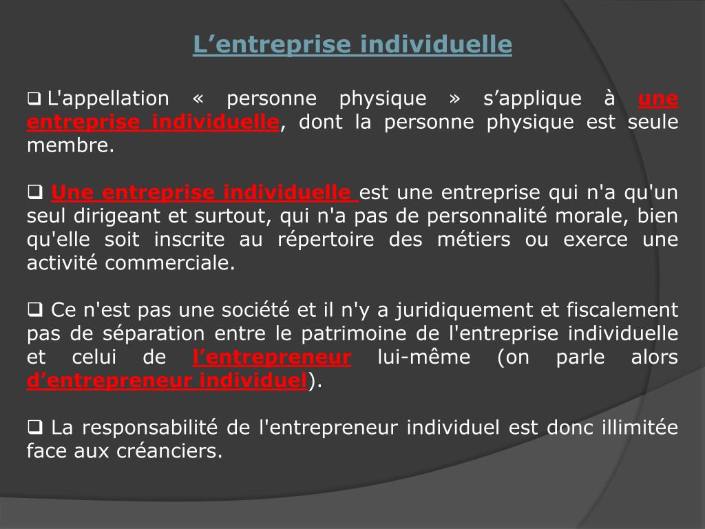 L’entreprise individuelle • L'appellation « personne physique » s’applique à une entreprise individuelle, dont la personne physique est seule membre. • Une entreprise individuelle est une entreprise qui n'a qu'un seul dirigeant et surtout, qui n'a pas de personnalité morale, bien qu'elle soit inscrite au répertoire des métiers ou exerce une activité commerciale. • Ce n'est pas une société et il n'y a juridiquement et fiscalement pas de séparation entre le patrimoine de l'entreprise individuelle et celui de l’entrepreneur lui-même (on parle alors d’entrepreneur individuel). • La responsabilité de l'entrepreneur individuel est donc illimitée face aux créanciers.