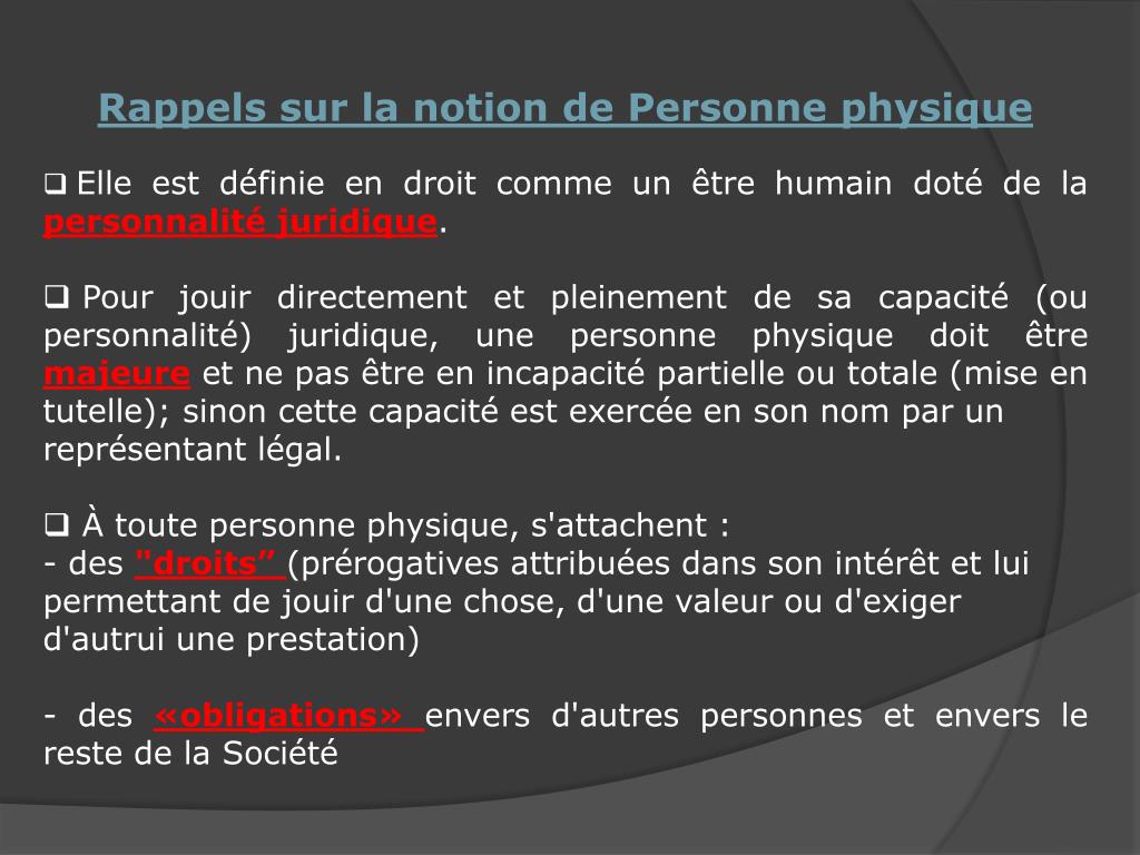 Rappels sur la notion de Personne physique • Elle est définie en droit comme un être humain doté de la personnalité juridique. • Pour jouir directement et pleinement de sa capacité (ou personnalité) juridique, une personne physique doit être majeure et ne pas être en incapacité partielle ou totale (mise en tutelle); sinon cette capacité est exercée en son nom par un • représentant légal. • À toute personne physique, s'attachent : • - des "droits” (prérogatives attribuées dans son intérêt et lui • permettant de jouir d'une chose, d'une valeur ou d'exiger • d'autrui une prestation) • - des «obligations» envers d'autres personnes et envers le reste de la Société