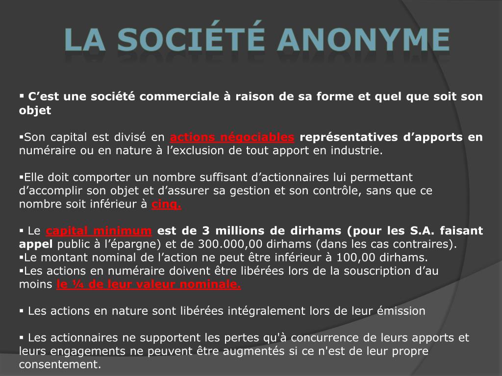 La société anonyme • C’est une société commerciale à raison de sa forme et quel que soit son objet • Son capital est divisé en actions négociables représentatives d’apports en numéraire ou en nature à l’exclusion de tout apport en industrie. • Elle doit comporter un nombre suffisant d’actionnaires lui permettant • d’accomplir son objet et d’assurer sa gestion et son contrôle, sans que ce • nombre soit inférieur à cinq. • Le capital minimum est de 3 millions de dirhams (pour les S.A. faisant appel public à l’épargne) et de 300.000,00 dirhams (dans les cas contraires). • Le montant nominal de l’action ne peut être inférieur à 100,00 dirhams. • Les actions en numéraire doivent être libérées lors de la souscription d’au • moins le ¼ de leur valeur nominale. • Les actions en nature sont libérées intégralement lors de leur émission • Les actionnaires ne supportent les pertes qu'à concurrence de leurs apports et • leurs engagements ne peuvent être augmentés si ce n'est de leur propre • consentement.