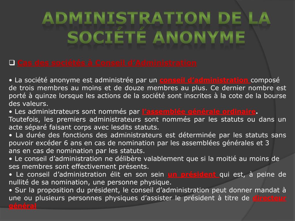 Administration de La Société anonyme • Cas des sociétés à Conseil d’Administration • • La société anonyme est administrée par un conseil d’administration composé • de trois membres au moins et de douze membres au plus. Ce dernier nombre est porté à quinze lorsque les actions de la société sont inscrites à la cote de la bourse des valeurs. • • Les administrateurs sont nommés par l’assemblée générale ordinaire. • Toutefois, les premiers administrateurs sont nommés par les statuts ou dans un acte séparé faisant corps avec lesdits statuts. • • La durée des fonctions des administrateurs est déterminée par les statuts sans pouvoir excéder 6 ans en cas de nomination par les assemblées générales et 3 • ans en cas de nomination par les statuts. • • Le conseil d’administration ne délibère valablement que si la moitié au moins de • ses membres sont effectivement présents. • • Le conseil d’administration élit en son sein un président qui est, à peine de nullité de sa nomination, une personne physique. • • Sur la proposition du président, le conseil d’administration peut donner mandat à une ou plusieurs personnes physiques d’assister le président à titre de directeur général