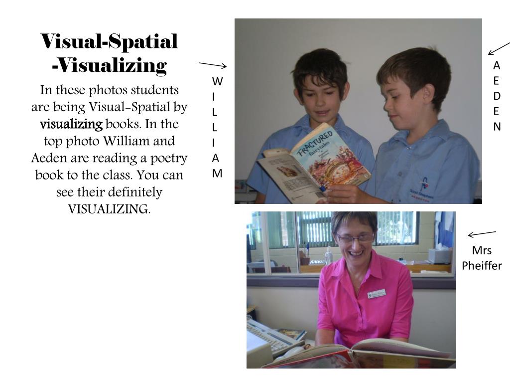 Visual-Spatial-Visualizing A E D E N W I L L I A M In these photos students are being Visual-Spatial by visualizingbooks. In the top photo William and Aeden are reading a poetry book to the class. You can see their definitely VISUALIZING. Mrs Pheiffer
