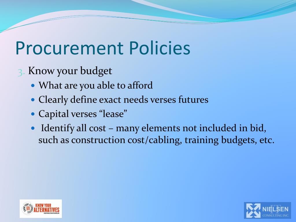 Procurement Policies 3. Know your budget • What are you able to afford • Clearly define exact needs verses futures • Capital verses “lease” • Identify all cost – many elements not included in bid, such as construction cost/cabling, training budgets, etc.