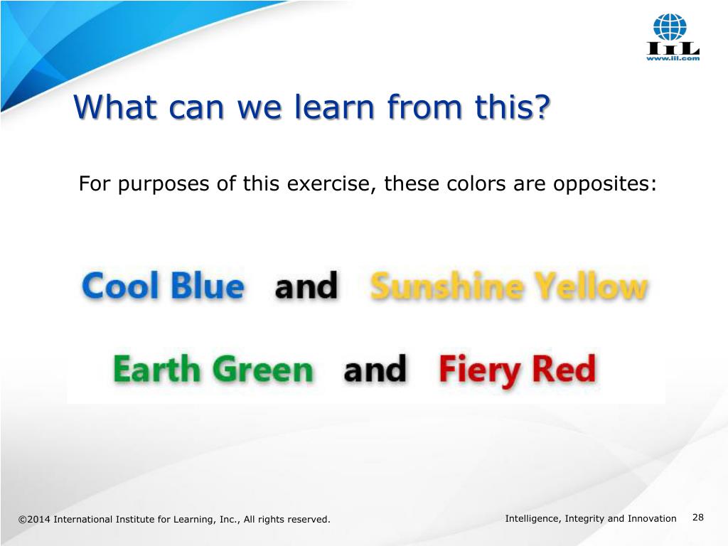 Please Keep in Mind… • Each person is a unique combination of ALL of the color energies. • 95% of people tend to have one color as their dominant color energy. • No color is “better” than another one. Ultimately, every system (project team, family, individual personality) strives for balance.