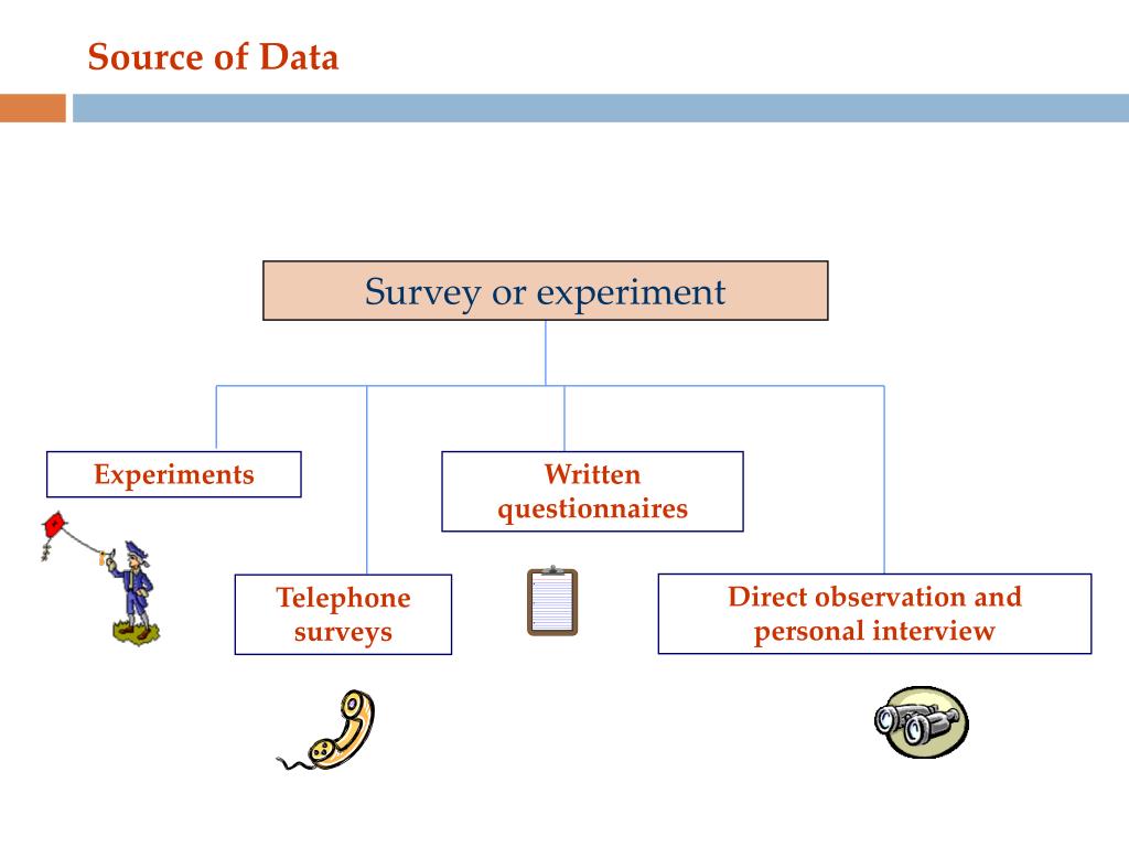 Source of Data Survey or experiment Experiments Written questionnaires Direct observation and personal interview Telephone surveys