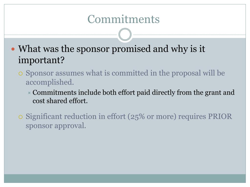 Commitments • What was the sponsor promised and why is it important? • Sponsor assumes what is committed in the proposal will be accomplished. • Commitments include both effort paid directly from the grant and cost shared effort. • Significant reduction in effort (25% or more) requires PRIOR sponsor approval.