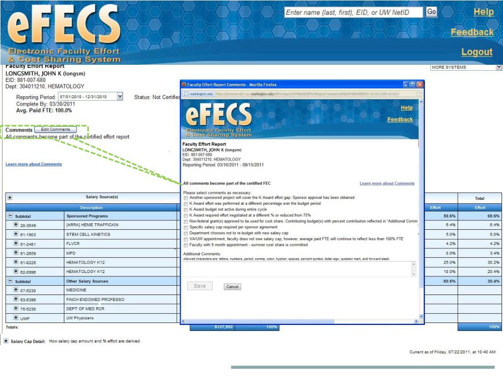 What to put in the Comment Box- or Not . • GOOD • Variations from normal reporting • Short term shift in funding. • Non-federal grant has approval to be used as a cost share source. • Reason FEC is being recertified. • BAD • This was not my plan. • The % effort is not consistent with what I understood it to be or as • listed in my support from the sponsor. • Have initialed corrections on [the FEC] when it went through my hands. • I do not understand the calculations. • This grant ended. There should be no charges on it after summer quarter.