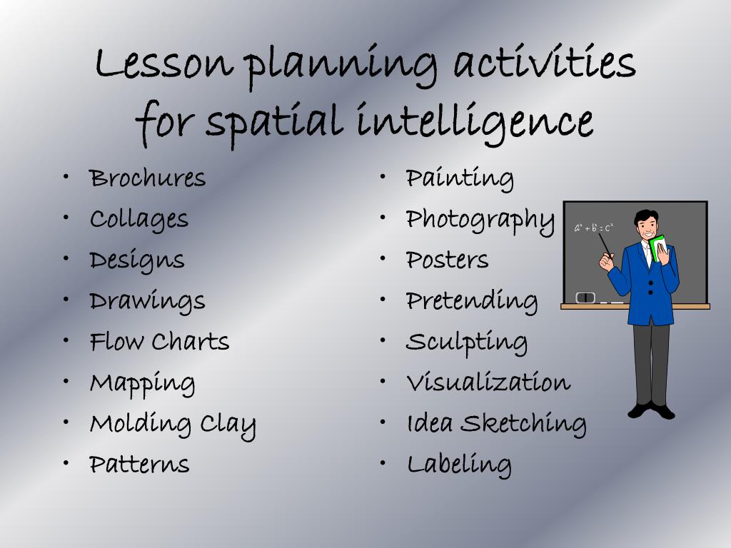 Brochures Collages Designs Drawings Flow Charts Mapping Molding Clay Patterns Painting Photography Posters Pretending Sculpting Visualization Idea Sketching Labeling Lesson planning activities for spatial intelligence