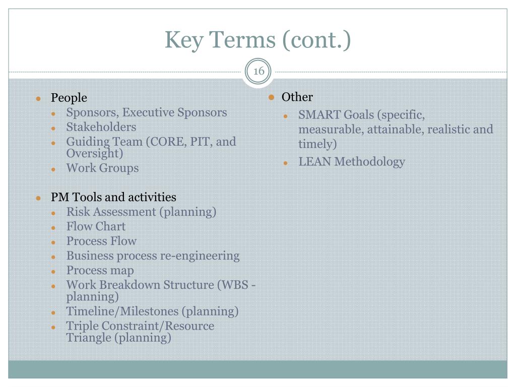 Key Terms (cont.) • People • Sponsors, Executive Sponsors • Stakeholders • Guiding Team (CORE, PIT, and Oversight) • Work Groups • PM Tools and activities • Risk Assessment (planning) • Flow Chart • Process Flow • Business process re-engineering • Process map • Work Breakdown Structure (WBS - planning) • Timeline/Milestones (planning) • Triple Constraint/Resource Triangle (planning) • Other • SMART Goals (specific, measurable, attainable, realistic and timely) • LEAN Methodology
