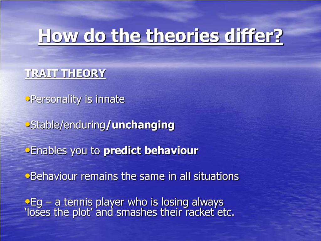How do the theories differ? TRAIT THEORY Personality is innate Stable/enduring/unchanging Enables you to predictbehaviour Behaviour remains the same in all situations Eg – a tennis player who is losing always ‘loses the plot’ and smashes their racket etc.