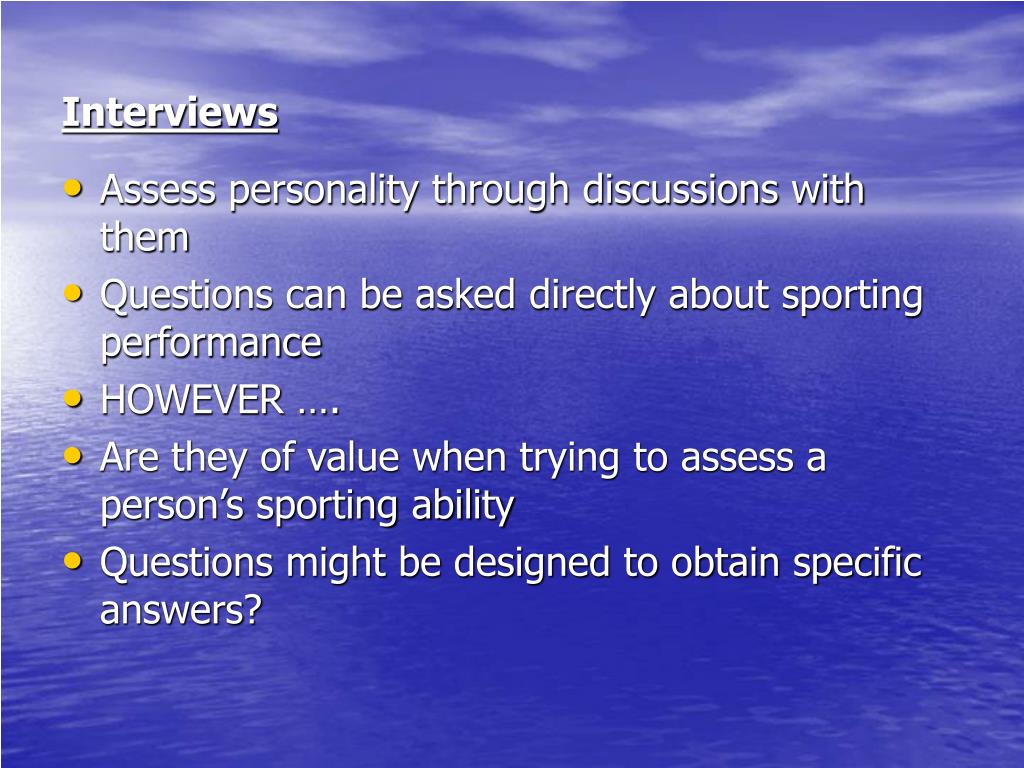 Interviews • Assess personality through discussions with them • Questions can be asked directly about sporting performance • HOWEVER …. • Are they of value when trying to assess a person’s sporting ability • Questions might be designed to obtain specific answers?