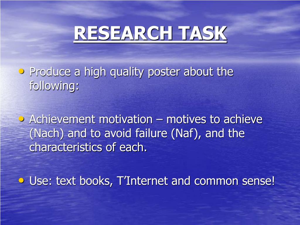 RESEARCH TASK • Produce a high quality poster about the following: • Achievement motivation – motives to achieve (Nach) and to avoid failure (Naf), and the characteristics of each. • Use: text books, T’Internet and common sense!
