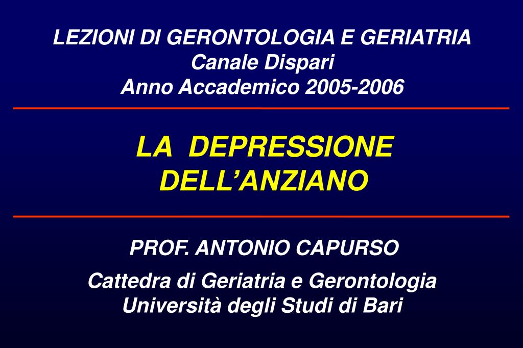 LEZIONI DI GERONTOLOGIA E GERIATRIA Canale Dispari Anno Accademico 2005-2006 LA DEPRESSIONE DELL’ANZIANO PROF. ANTONIO CAPURSO Cattedra di Geriatria e Gerontologia Università degli Studi di Bari
