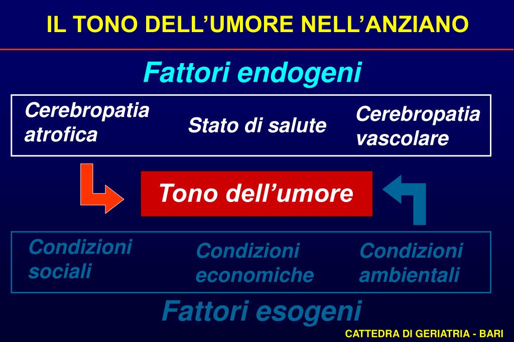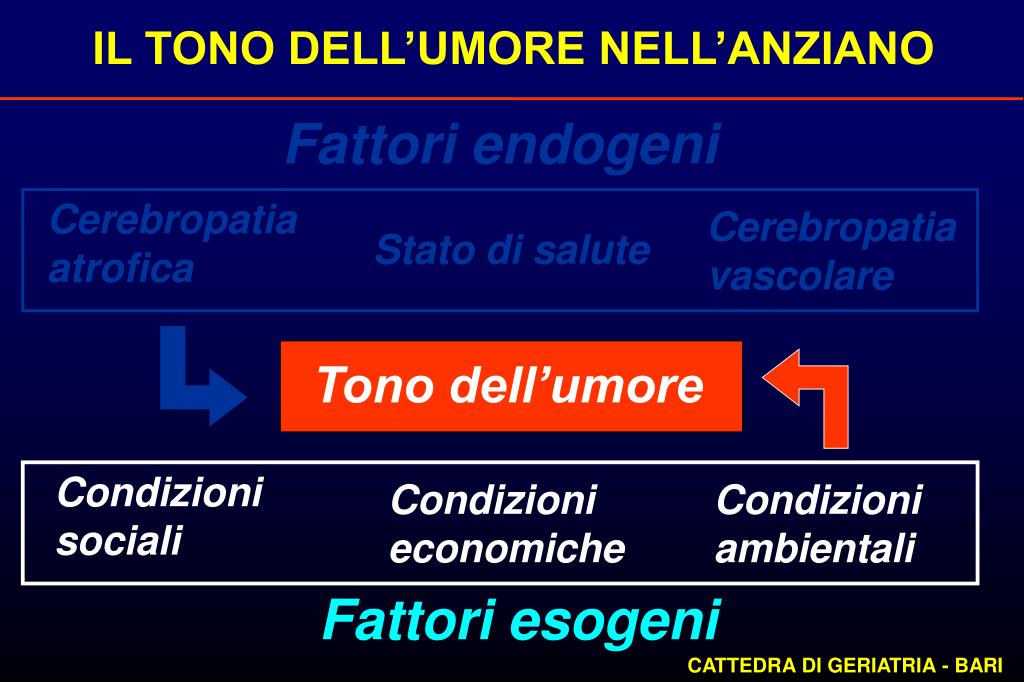 IL TONO DELL’UMORE NELL’ANZIANO Fattori endogeni Cerebropatia atrofica Cerebropatia vascolare Stato di salute Tono dell’umore Condizioni sociali Condizioni economiche Condizioni ambientali Fattori esogeni CATTEDRA DI GERIATRIA - BARI