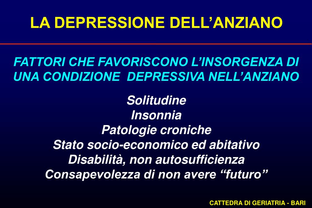 LA DEPRESSIONE DELL’ANZIANO FATTORI CHE FAVORISCONO L’INSORGENZA DI UNA CONDIZIONE DEPRESSIVA NELL’ANZIANO Solitudine Insonnia Patologie croniche Stato socio-economico ed abitativo Disabilità, non autosufficienza Consapevolezza di non avere “futuro” CATTEDRA DI GERIATRIA - BARI