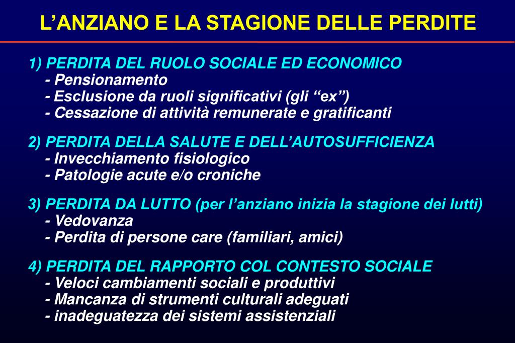 L’ANZIANO E LA STAGIONE DELLE PERDITE 1) PERDITA DEL RUOLO SOCIALE ED ECONOMICO - Pensionamento - Esclusione da ruoli significativi (gli “ex”) - Cessazione di attività remunerate e gratificanti 2) PERDITA DELLA SALUTE E DELL’AUTOSUFFICIENZA - Invecchiamento fisiologico - Patologie acute e/o croniche 3) PERDITA DA LUTTO (per l’anziano inizia la stagione dei lutti) - Vedovanza - Perdita di persone care (familiari, amici) 4) PERDITA DEL RAPPORTO COL CONTESTO SOCIALE - Veloci cambiamenti sociali e produttivi - Mancanza di strumenti culturali adeguati - inadeguatezza dei sistemi assistenziali
